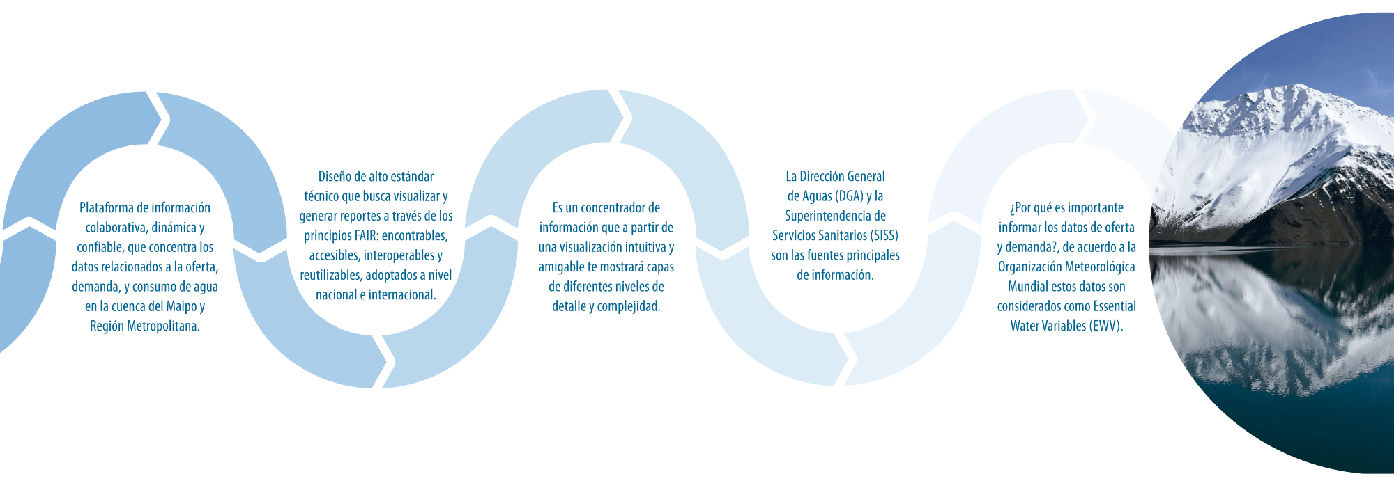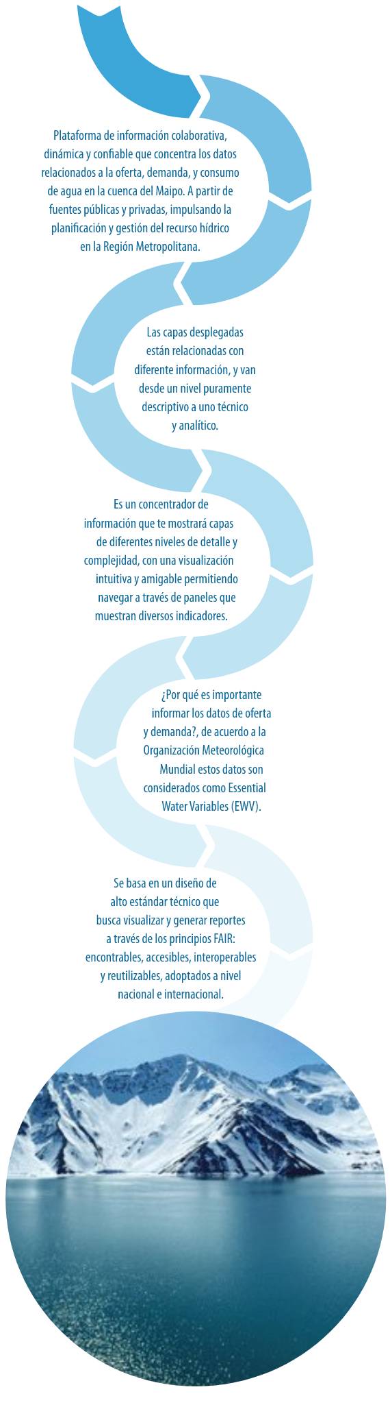 , es un espacio de navegación amigable, donde encontrarás el primer diagnóstico de la cuenca, Región Metropolitana y sus comunas, además de un espacio de reportabilidad en la que accederás en detalle a diferentes tableros de análisis de datos hídricos.